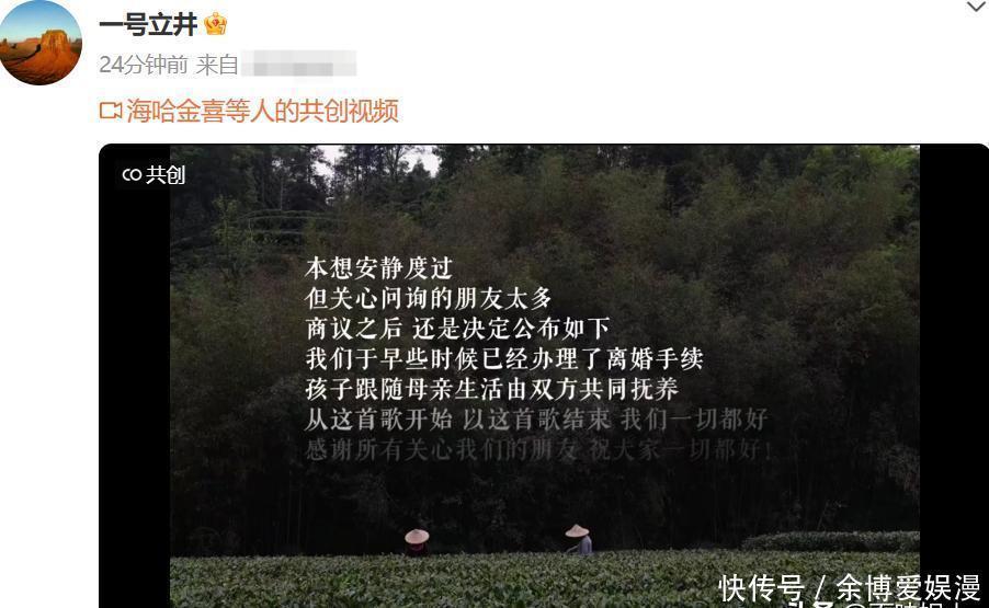 李亚鹏海哈金喜离婚,网友预言又成真,原因疑曝光,其实早有预料 10 月 14 号,娱乐圈又爆大新闻啦,李亚鹏和海哈金喜居然官宣离婚了,消息一出来,立马就冲上热搜顶了。这次他俩是一起发视频说的,还说早就办了离婚手续,孩子跟着妈妈过,俩人一起养。 好多网友都吓了一跳,毕竟六一儿童节的时候,还看见他俩带着孩子一块儿玩呢,当时大家还羡慕这一家三口挺幸福的,谁能想到才几个月,就变成这样了。至于为啥离婚,他俩没说。不过前两天海哈金喜发过一个特伤感的视频,虽说没说啥事儿,但能看出来她心情特别不好。