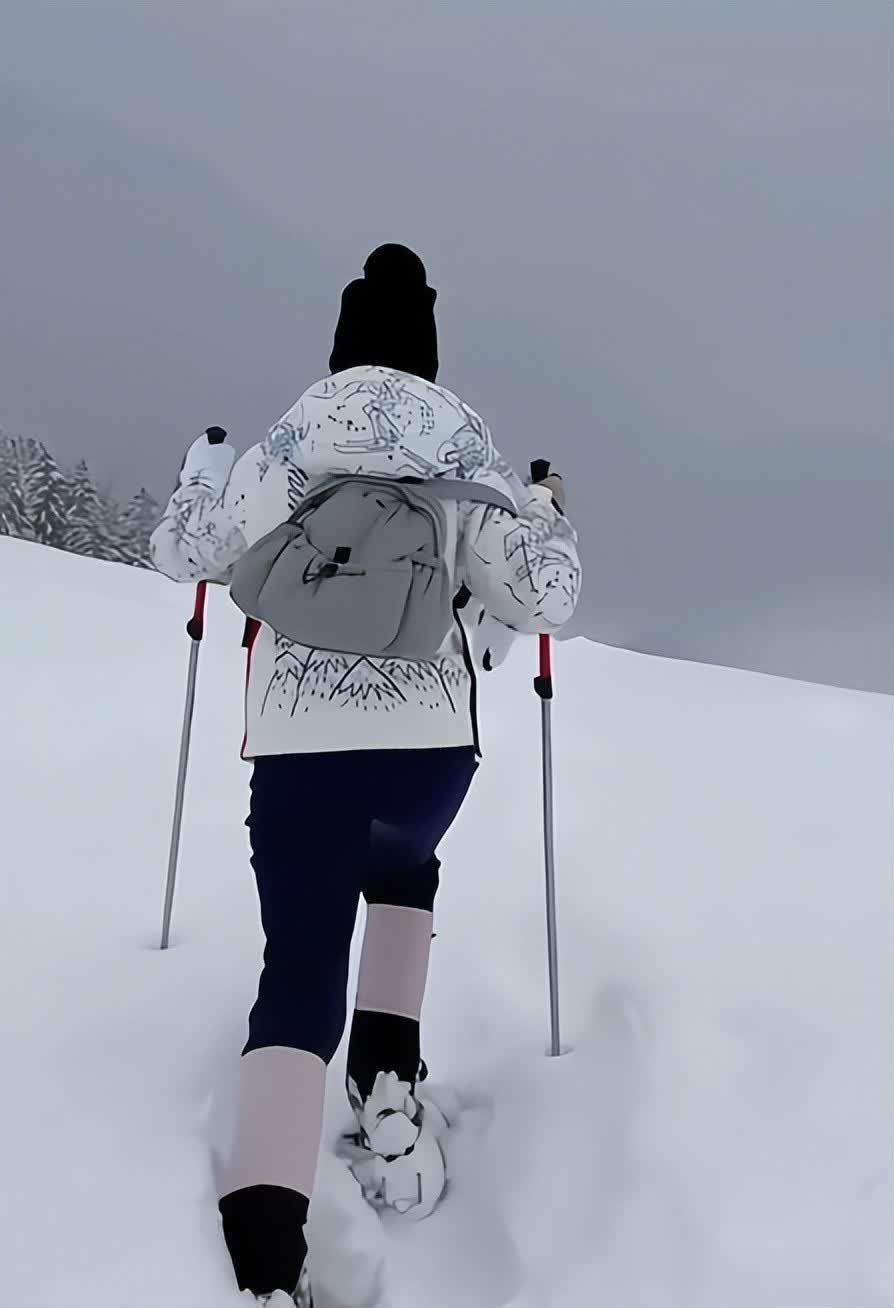 在爬山的过程中,章泽天努力地跟同行的人一起前进,雪山上的雪很厚,爬起来不是很顺畅,但是好在章泽天也顺利完成了任务。